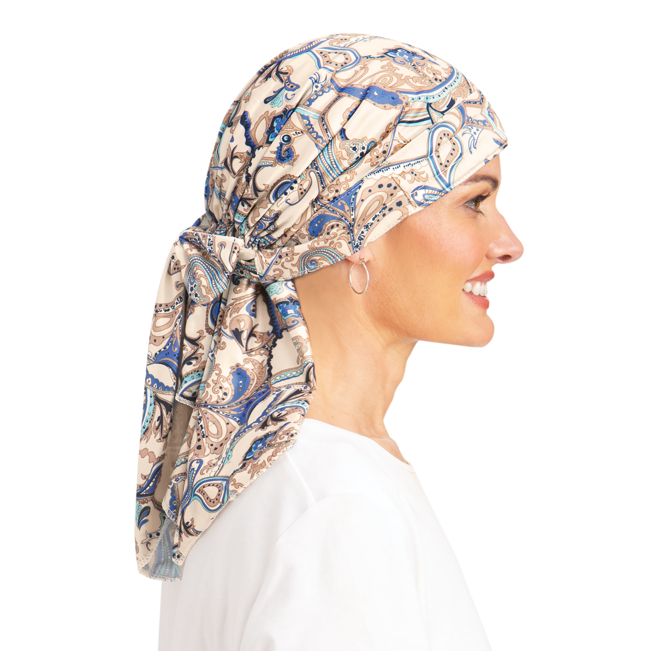 Paisley Print Silky Pre-Tied Soft Head Wrap Gender Neutral Blue. This pre-tied silky soft scarf features a gently padded contoured front for comfort and a stylish paisley print. The pre-tied, adjustable design makes it easy to put on and take off quickly providing complete head coverage. Machine wash. Polyester, i... - Paisley Print Silky Pre-Tied Soft Head Wrap Gender Neutral Blue.